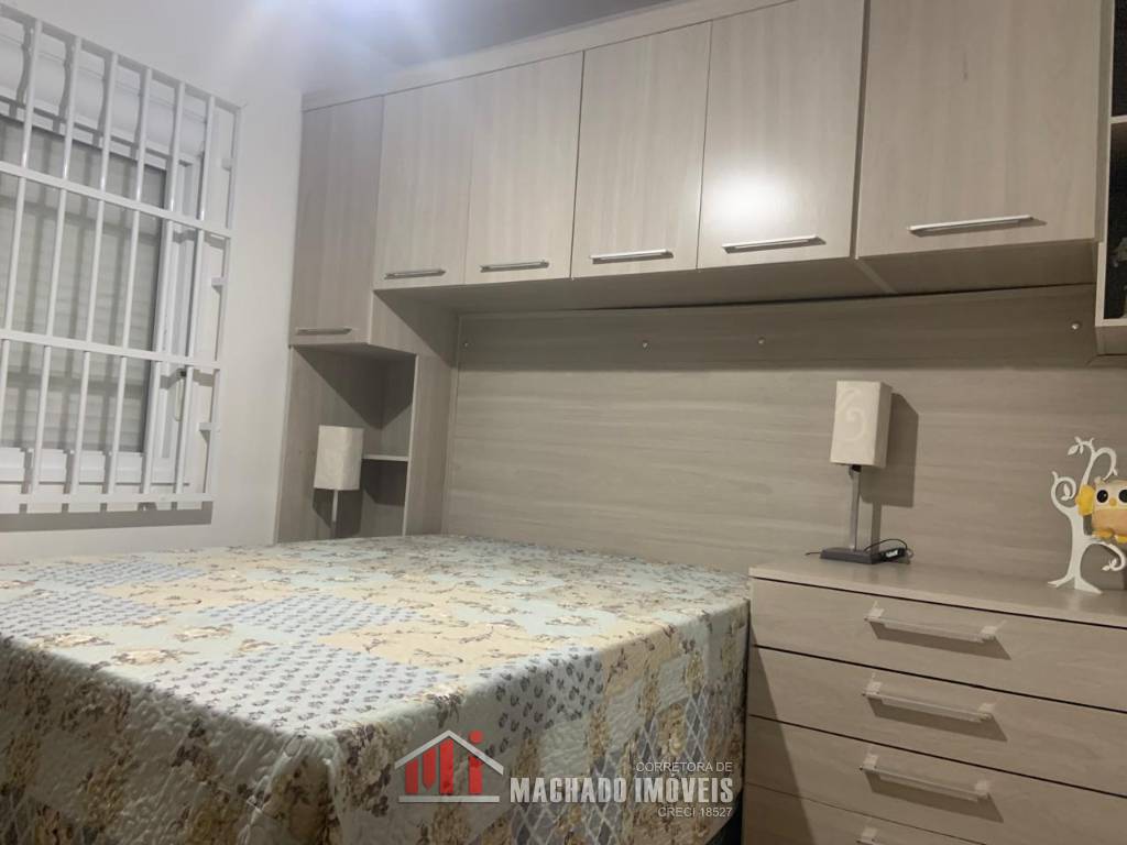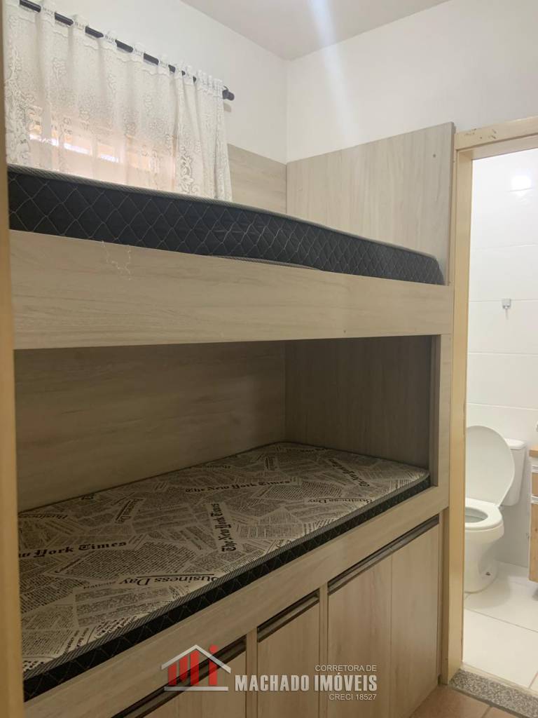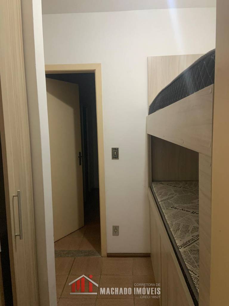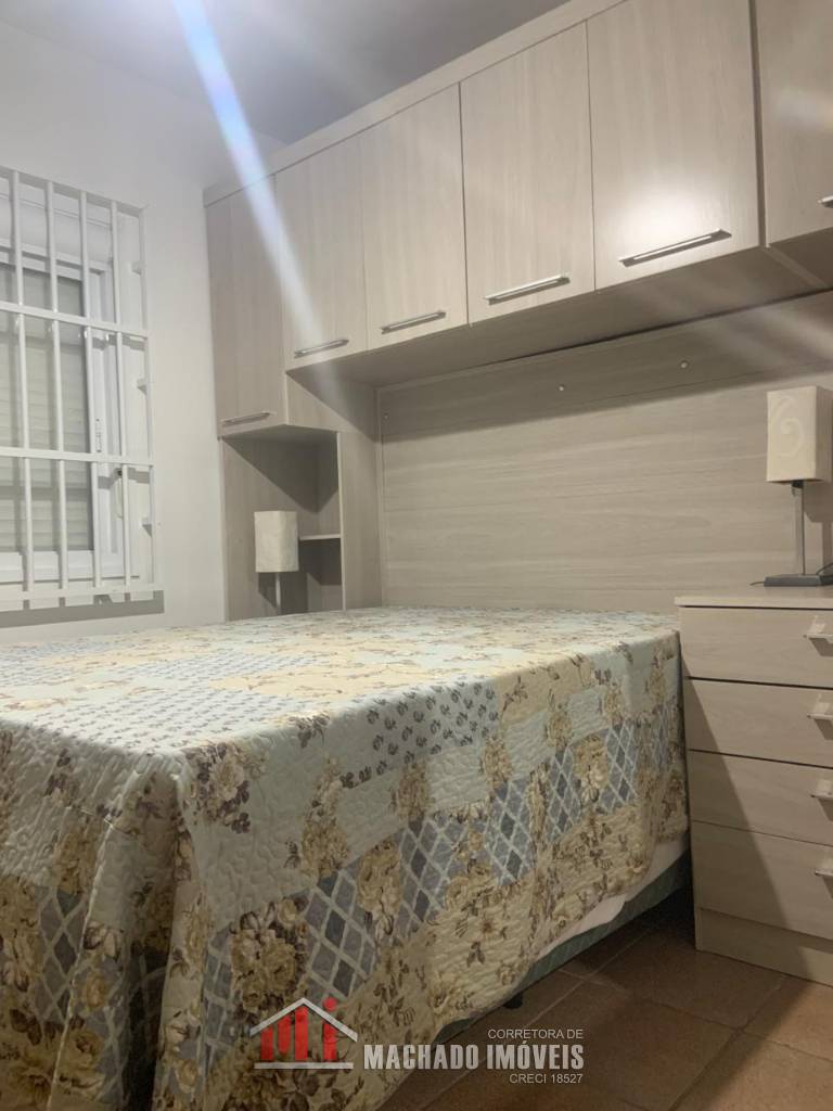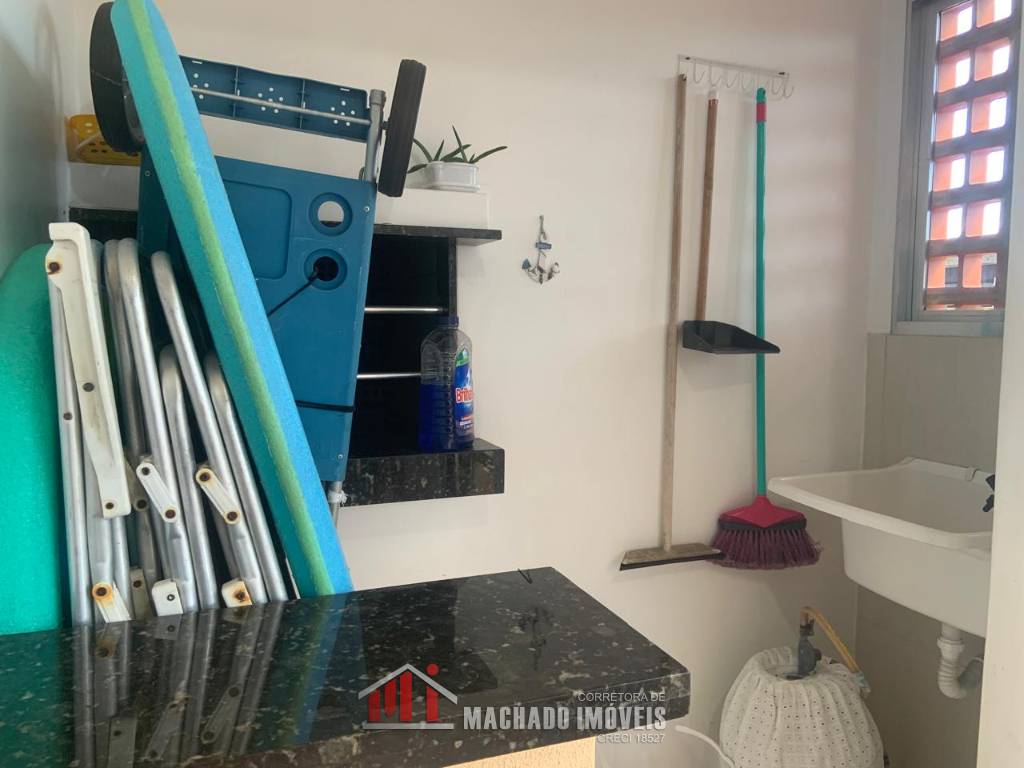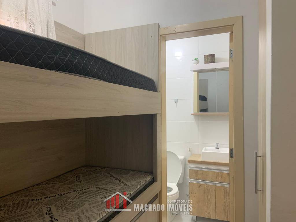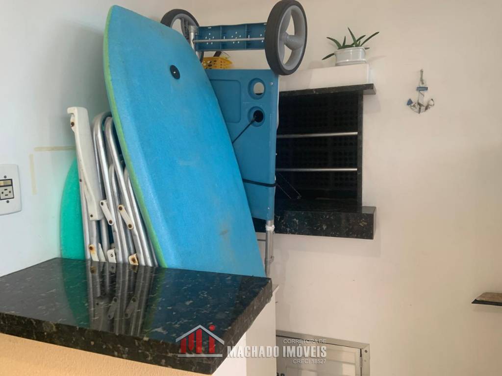 Apto térreo, 01 e 1/2 dormitório, sala e cozinha americana, sacada com área de serviço, churrasqueira, ventiladores de teto