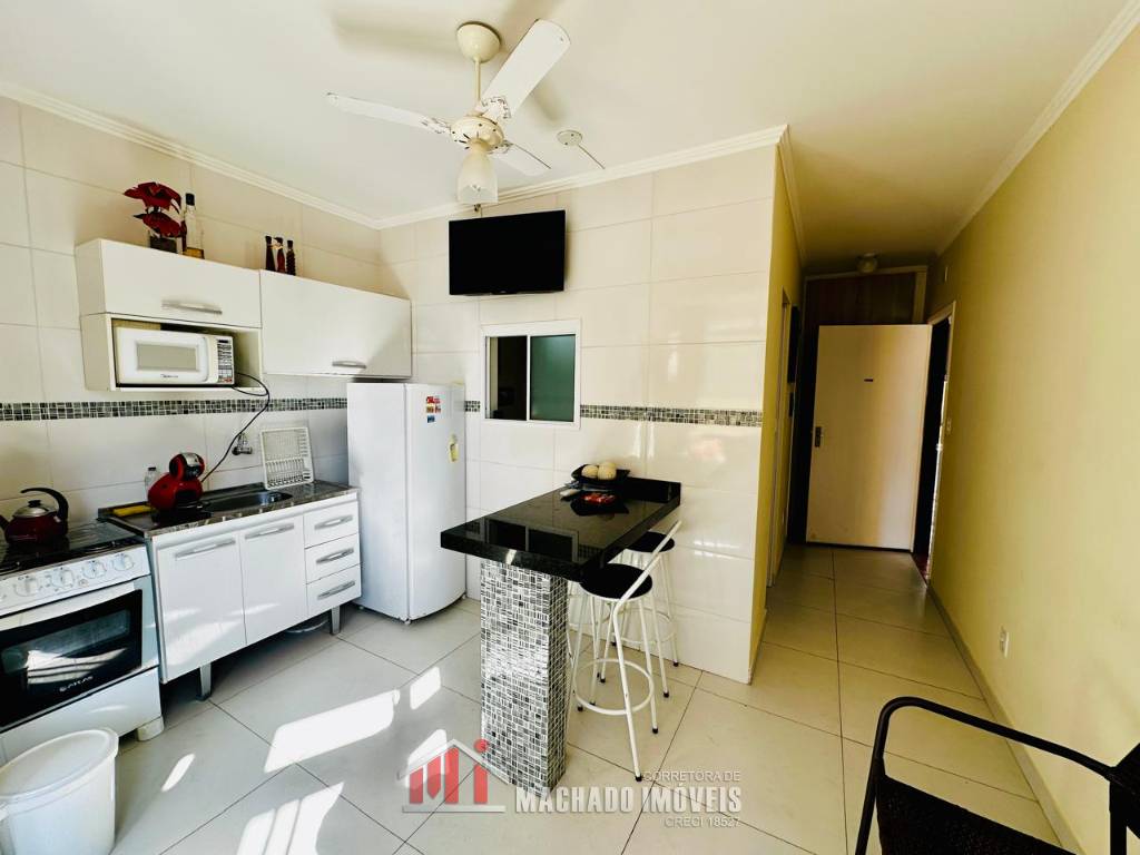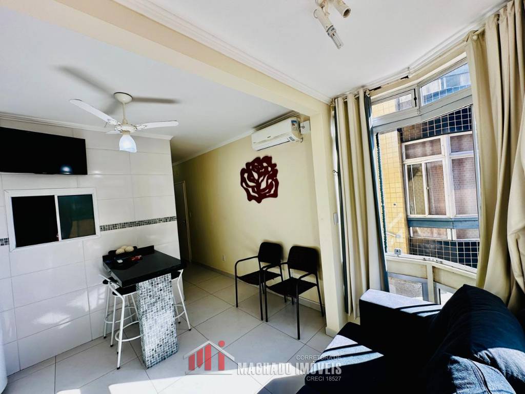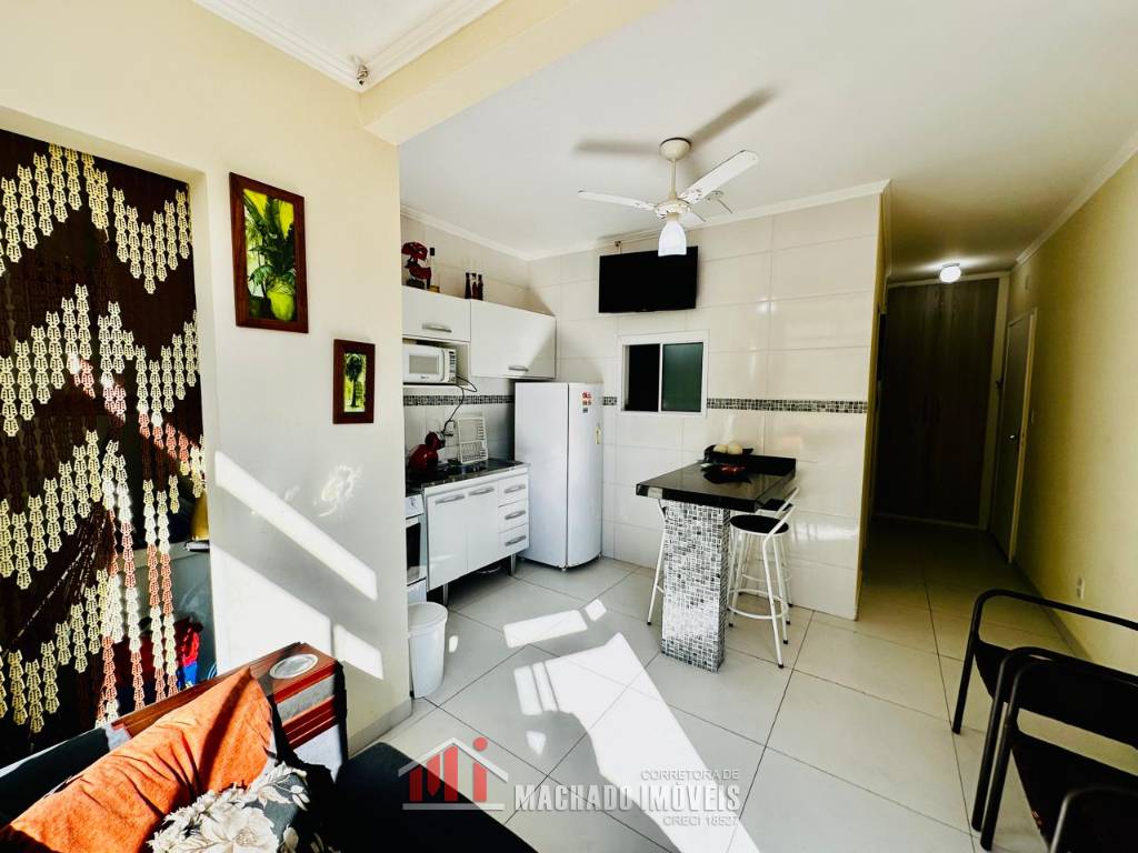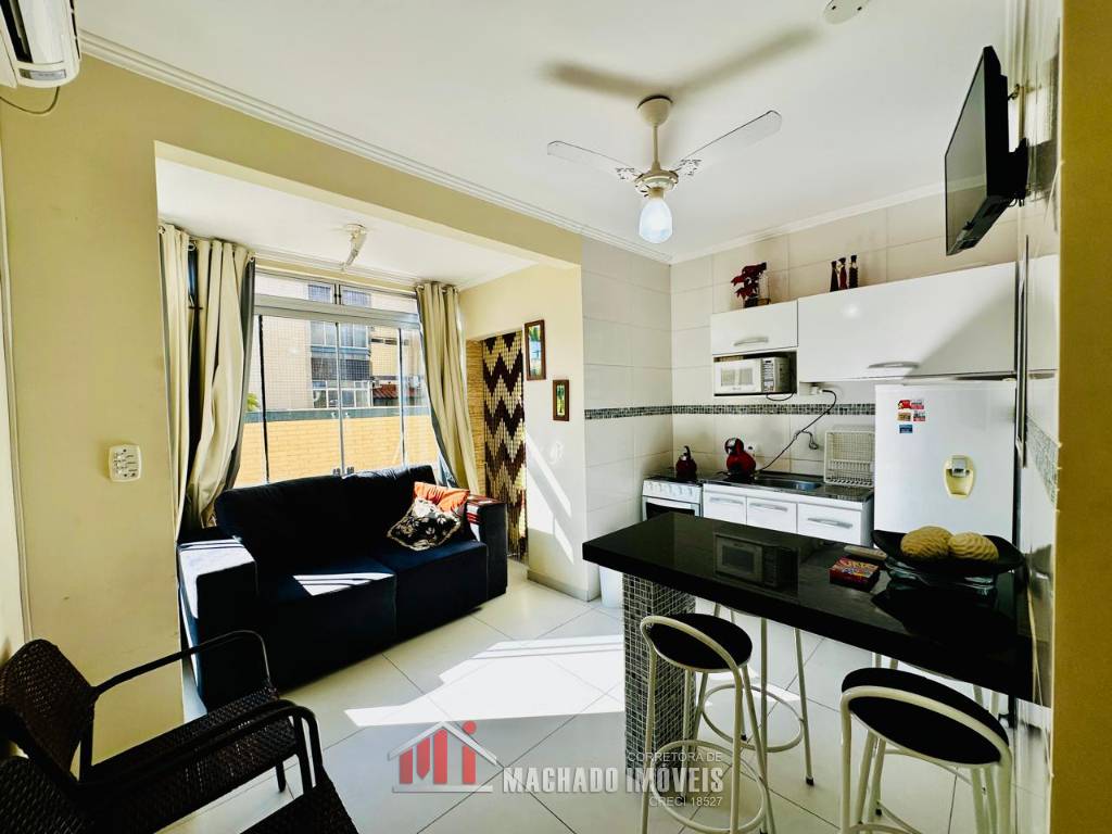 Apto térreo interno, 01 dormitório, sala e cozinha americana, integrada com sacada "norte", área de serviço, churrasqueira, banheiro social, todo mobiliado e reformado, ar condicionado, máquina de lavar estilo tanquinho, box interno para veículo, condomínio com infra de piscinas, apenas 250m/mar Aceita financiamento bancário