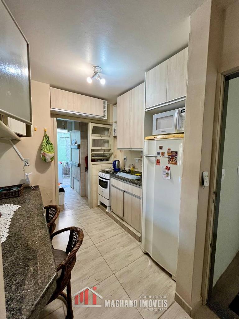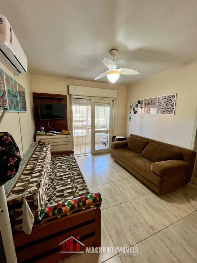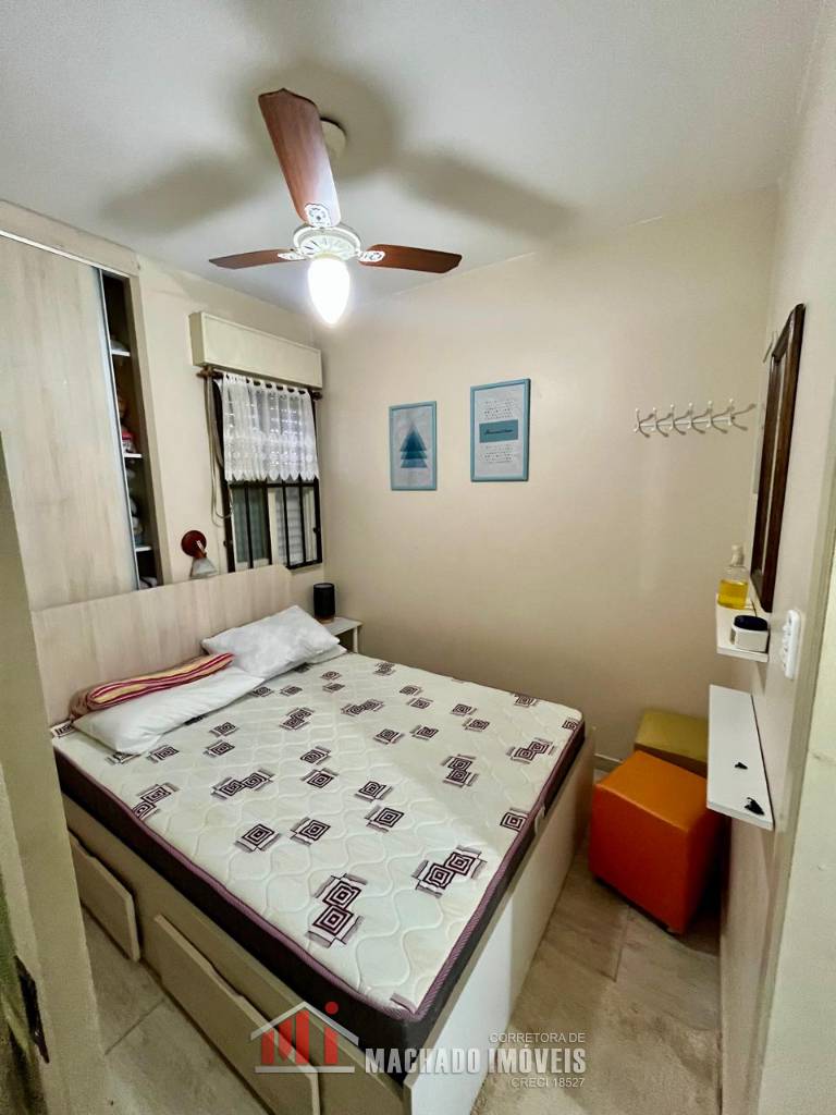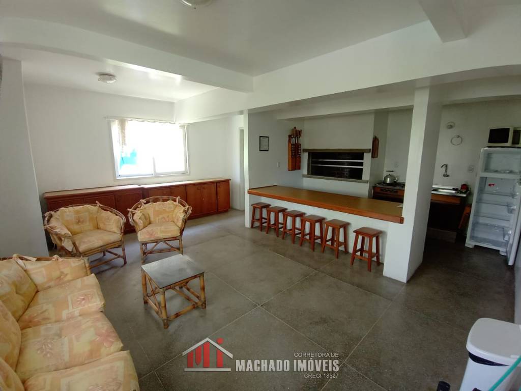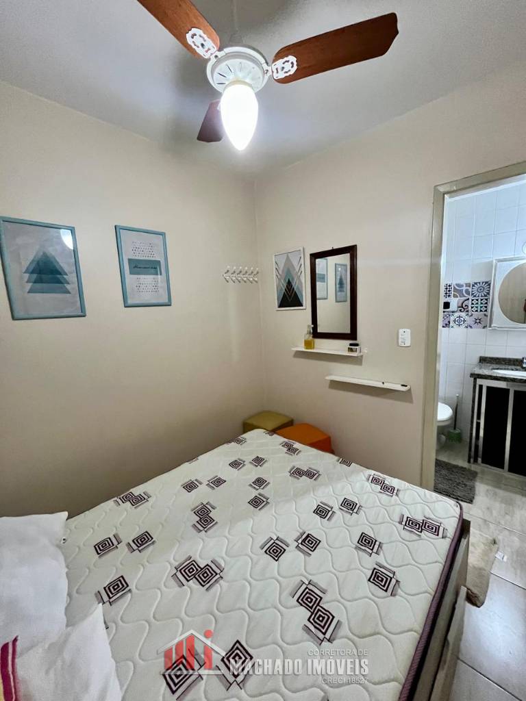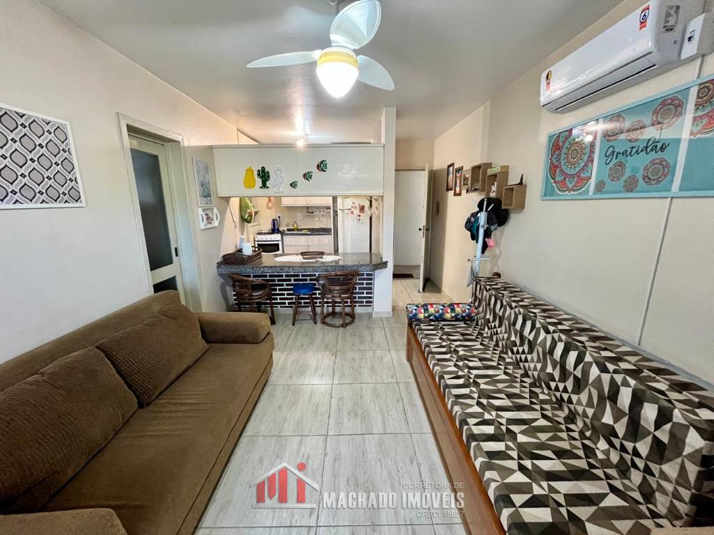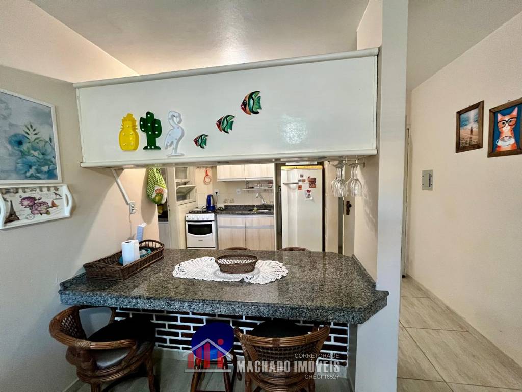 Apartamento térreo, com terraço privativo, 01 dormitório, banheiro social, sala e cozinha americana, área de serviço, churrasqueira, bem mobiliado e decorado, sacada fechada, com box interno descoberto, condomínio com infra de piscinas, em torno de 450m/mar