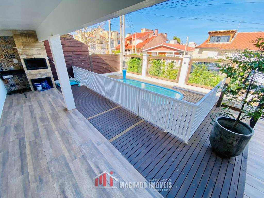 Casa 03 dormitórios, sendo 01 suíte, cozinha com bancada, sala de jantar e estar com lareira, banheiro social, garagem, pergolado em frente, com churrasqueira e PISCINA, pátio fechado, fundos com espaço gourmet, churrasqueira, fogão campeiro, em torno de 250m/mar