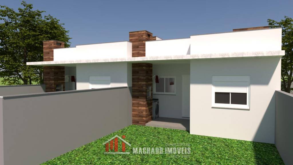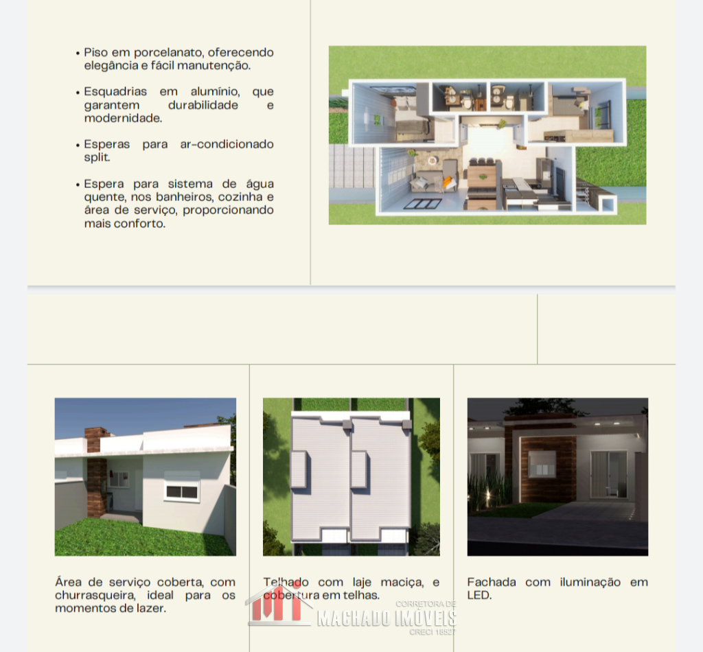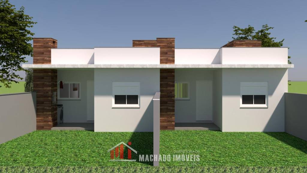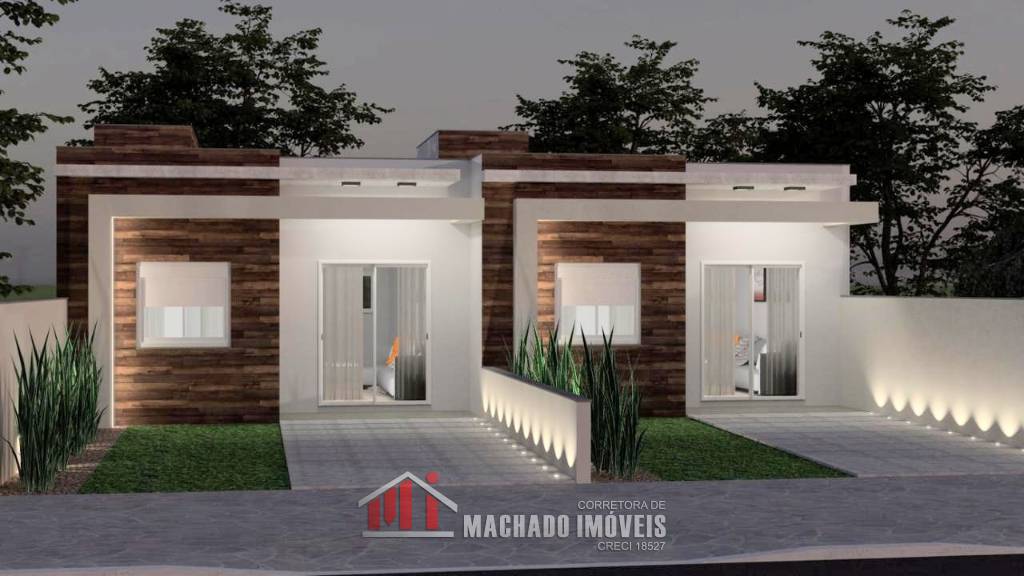 Casa geminada 02 dormitórios, sala e cozinha americana, banheiro social, churrasqueira, piso de porcelanato, gesso, ...
