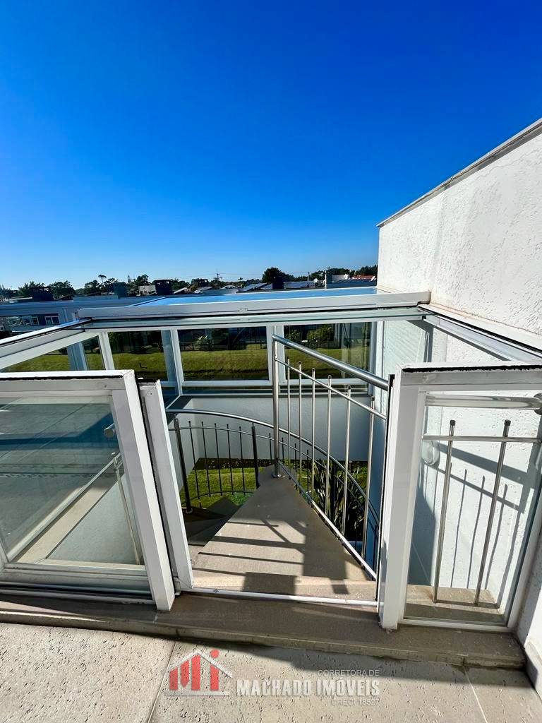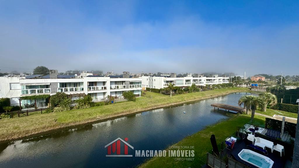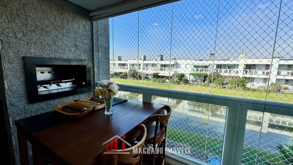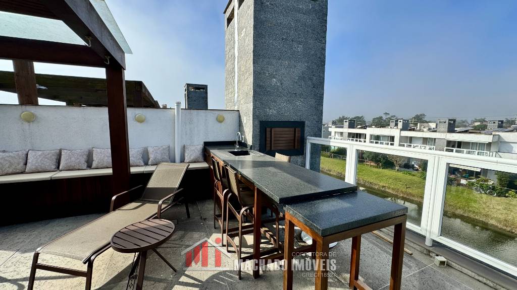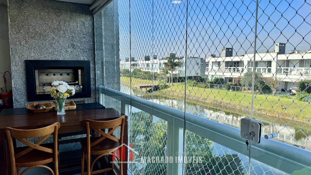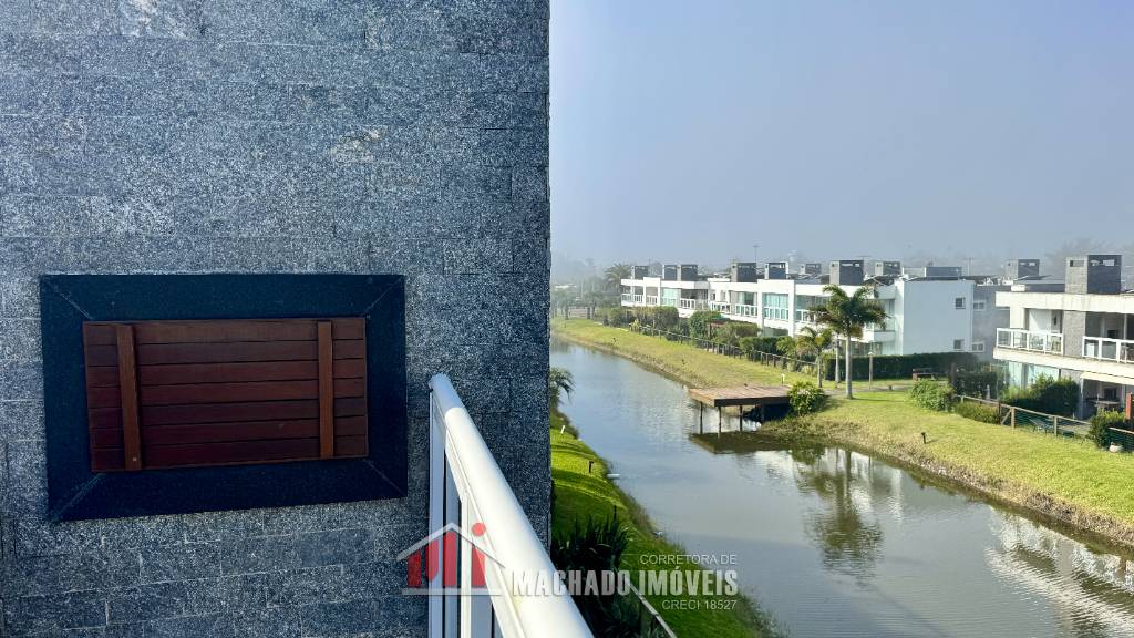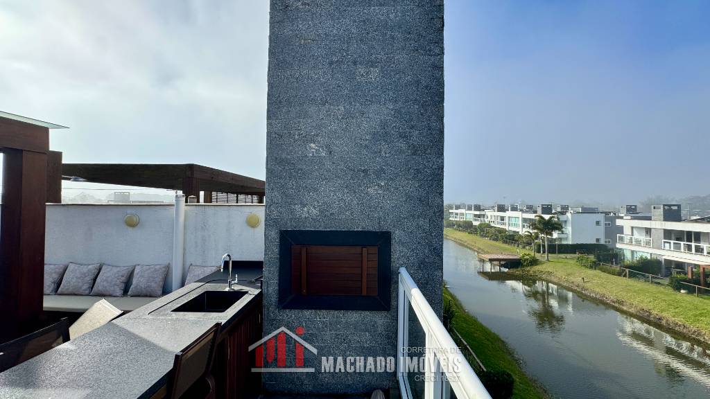Casa mobiliada, 2 dormitórios (sendo 1 suíte), banheiro social, cozinha americana, living com lareira ecológica, lavanderia separada, sacada beira lago com churrasqueira, 2 vagas de garagem (1 coberta), no terraço, pergolado com cobertura de vidro, espaço, gourmet com churrasqueira e banheira.