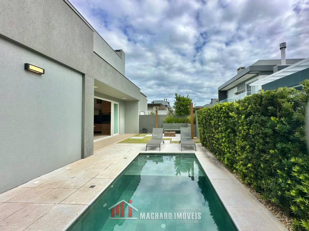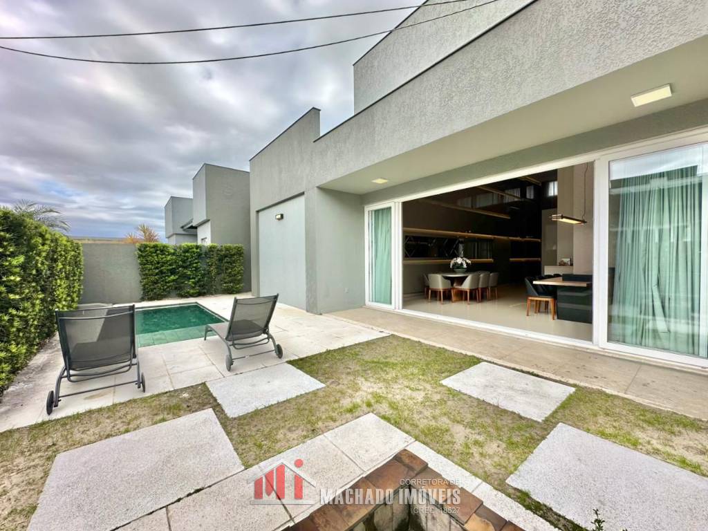 CAPÃO ILHAS RESORT Casa térrea 04 Suítes, amplo Living c/ pé direito duplo, sala de estar integrada com sala de jantar, móveis planejados Dalmobile, lavabo, lareira, cozinha americana, churrasqueira equipada, lavanderia completa, mobiliada, decorada e toda climatizada, piscina de concreto, espaço fireplace, 210m², terreno com 14.1 X 28 metros, abrigo p/ 2 carros. Estuda receber imóveis em Capão, Xangri lá, carro, prazo direto