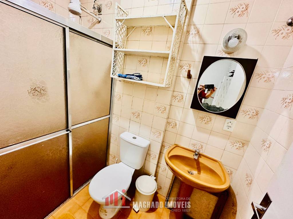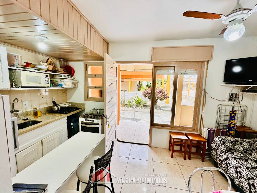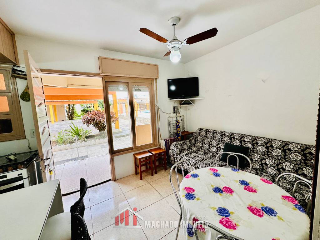 JK térreo, transformado em 1 dormitório, sala e cozinha americana, sacada com churrasqueira, mobiliado, box coberto. Condomínio com infra, piscinas, pracinha, salão de festas, cancha de bocha, lavanderia, em torno de 600m/mar