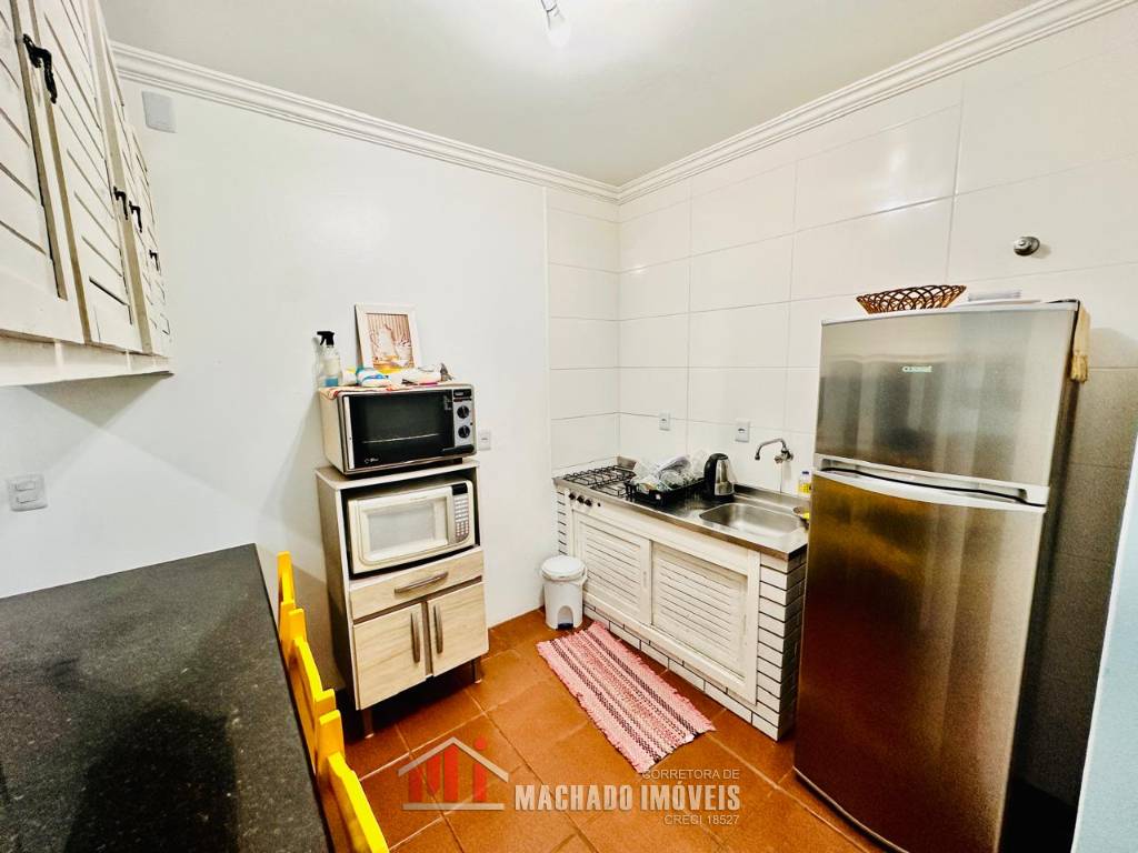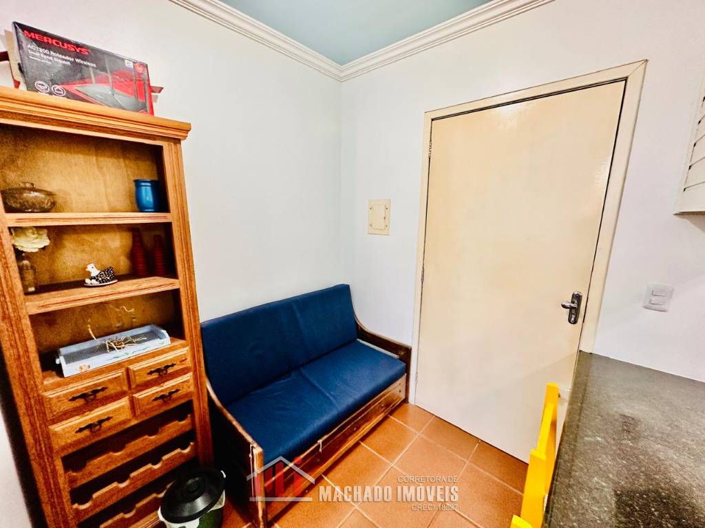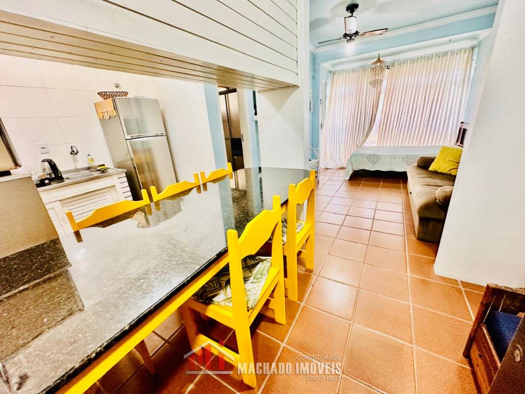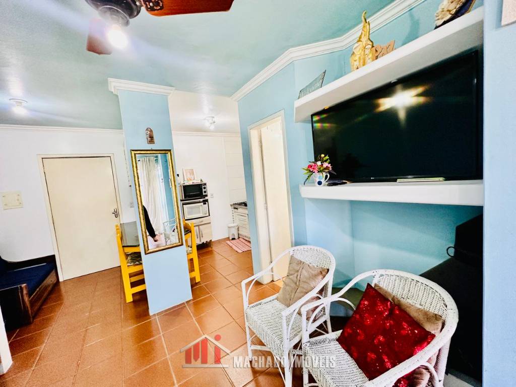 JK sala de estar, cozinha, sacada fechada com churrasqueira e área de serviço, mobiliado, box coberto para veículo, condomínio em torno de 600m/mar, com infra de piscinas aceita financiamento bancário