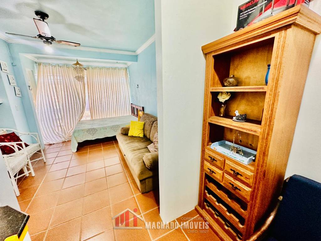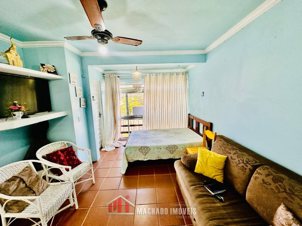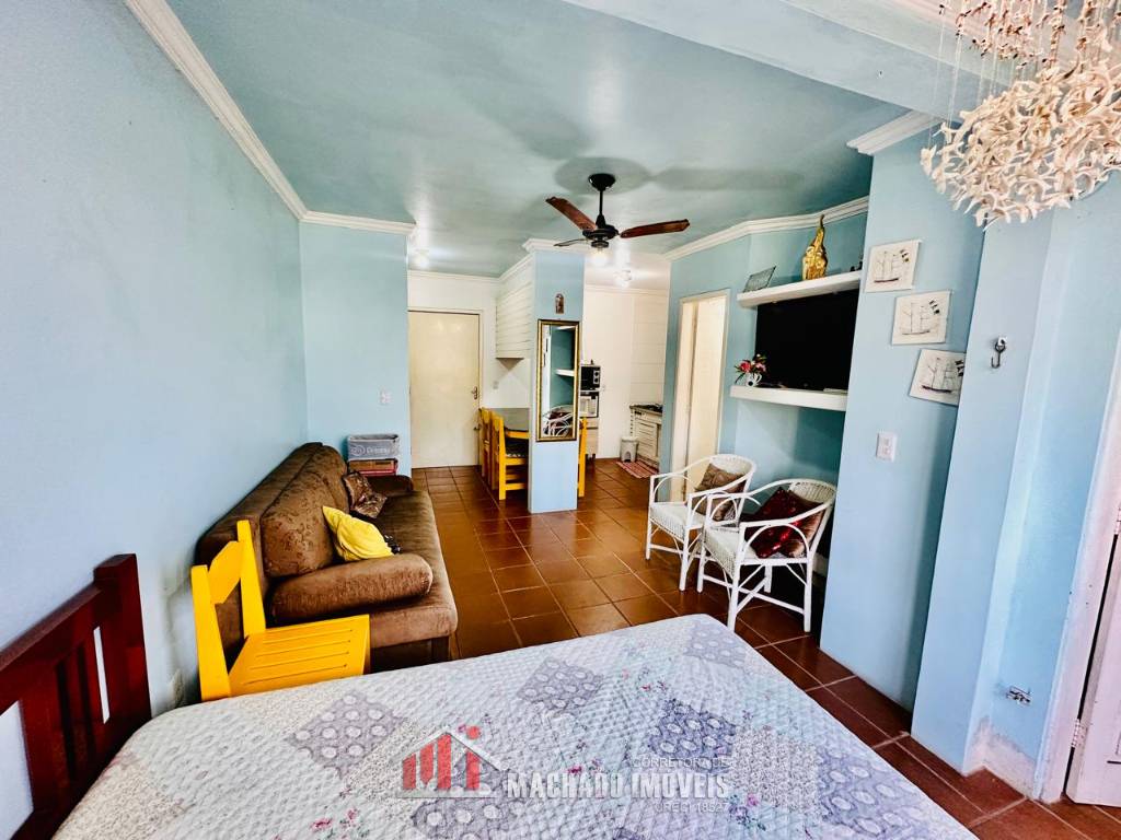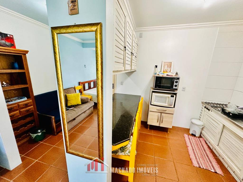 JK sala de estar, cozinha, sacada fechada com churrasqueira e área de serviço, mobiliado, box coberto para veículo, condomínio em torno de 600m/mar, com infra de piscinas aceita financiamento bancário