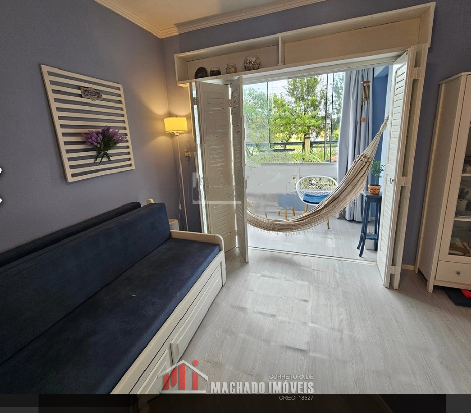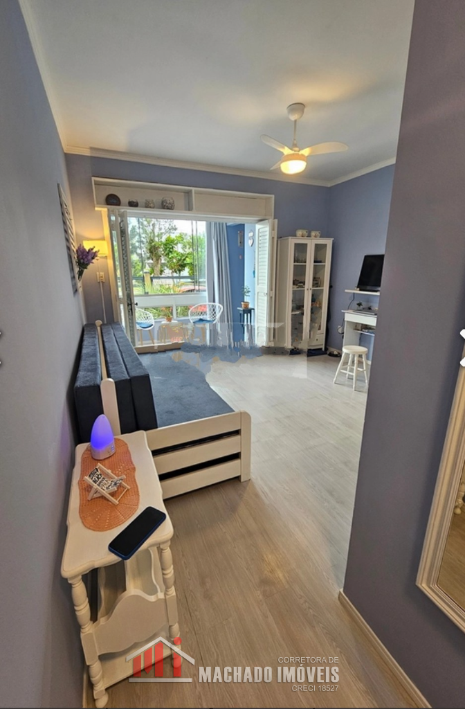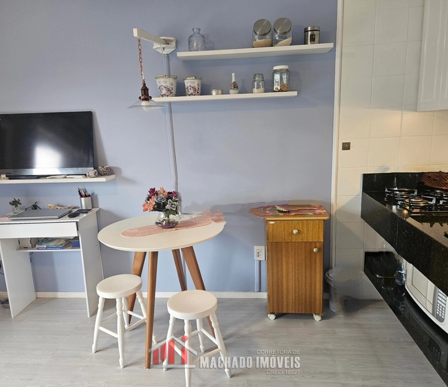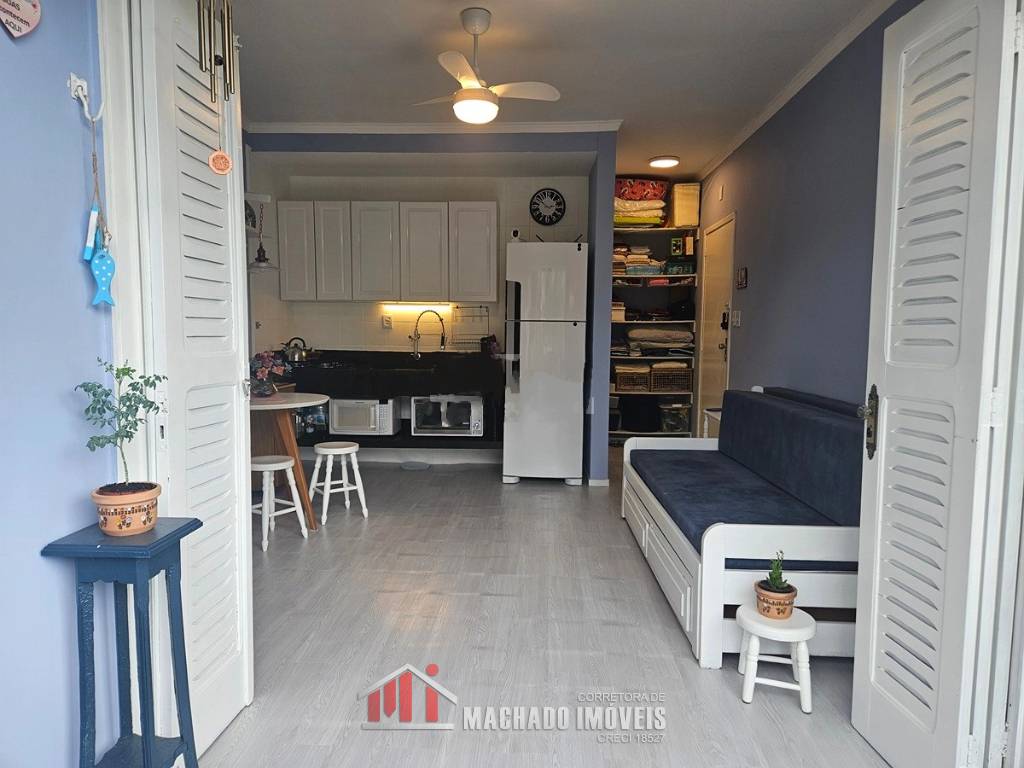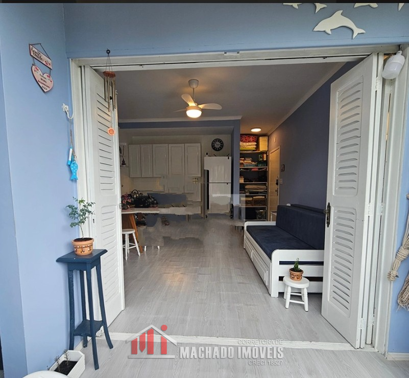 JK térreo, todo reformado, sala e cozinha americana, banheiro social, sacada, área de serviço e churrasqueira, mobiliado, box para veículo, condomínio com infra de piscinas, apenas 250m/mar Aceita financiamento bancário